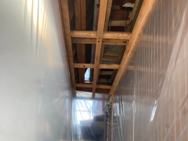 まず、作業区画全体を、写真のように厚手のビニールシートで隙間なく覆い、完全に密閉された空間を作り出します。これを「隔離養生」と呼びます。