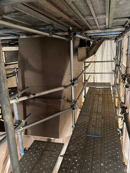 写真でも確認できる通り、隔離養生された作業場内は太陽の光が届かず、暗くなります。