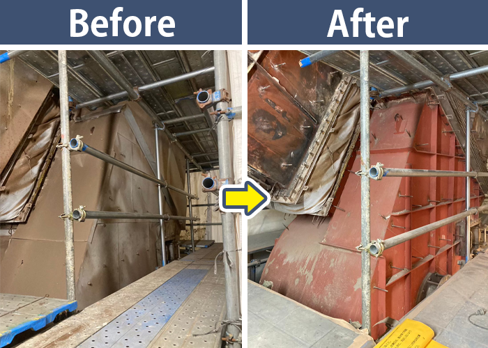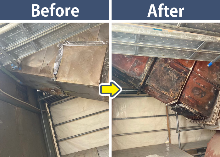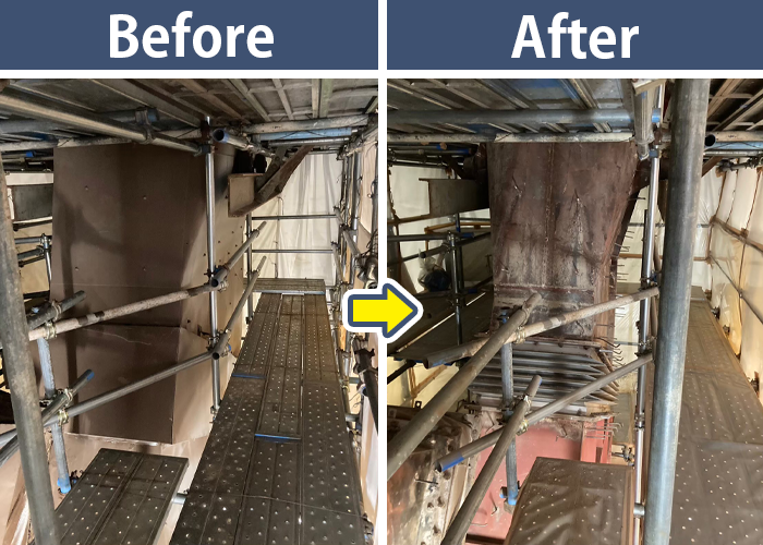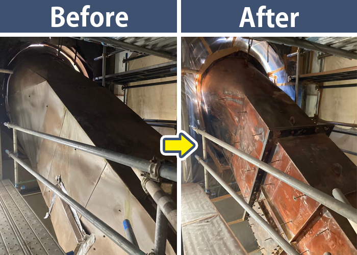 巨大な配管にある保温材の除去前後をご覧ください!