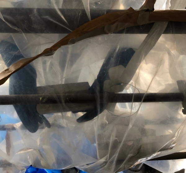 そのうえで、隔離エリア内の空気を強力な機械で吸い出します。これは負圧管理といって、中に溜まったアスベストが外に漏れるのを防ぐ技術です。