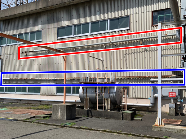 赤枠と青枠で囲まれている配管が今回除去工事を行う配管となります。