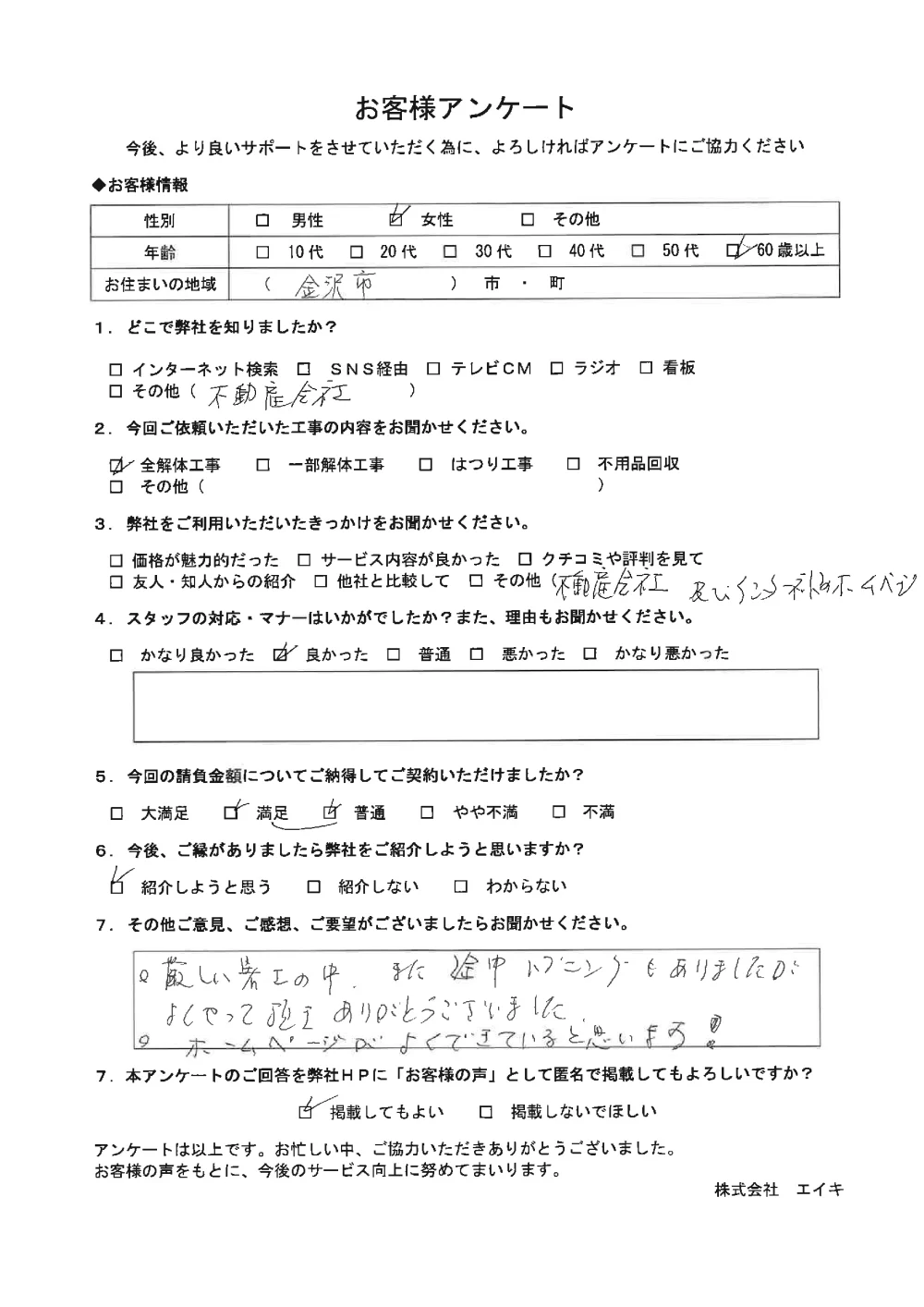 厳しい着工の中、ありがとうございました。| お客様アンケート【金沢市 全解体工事】
