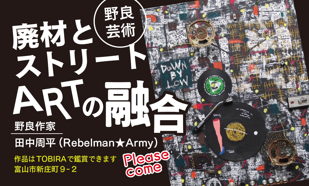 リサイクル事業部が運営するアンティーク&リユースショップ「TOBIRA(以下、トベラ)」では、富山出身の作家Rebelman★Armyさんこと田中周平さんが手掛けたアート作品を展示しております。