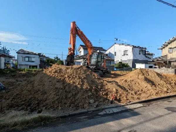(解説:建物の横で、外構工事をするユンボ。まだ建物は立っていますが、緊張感が伝わってきますね!)